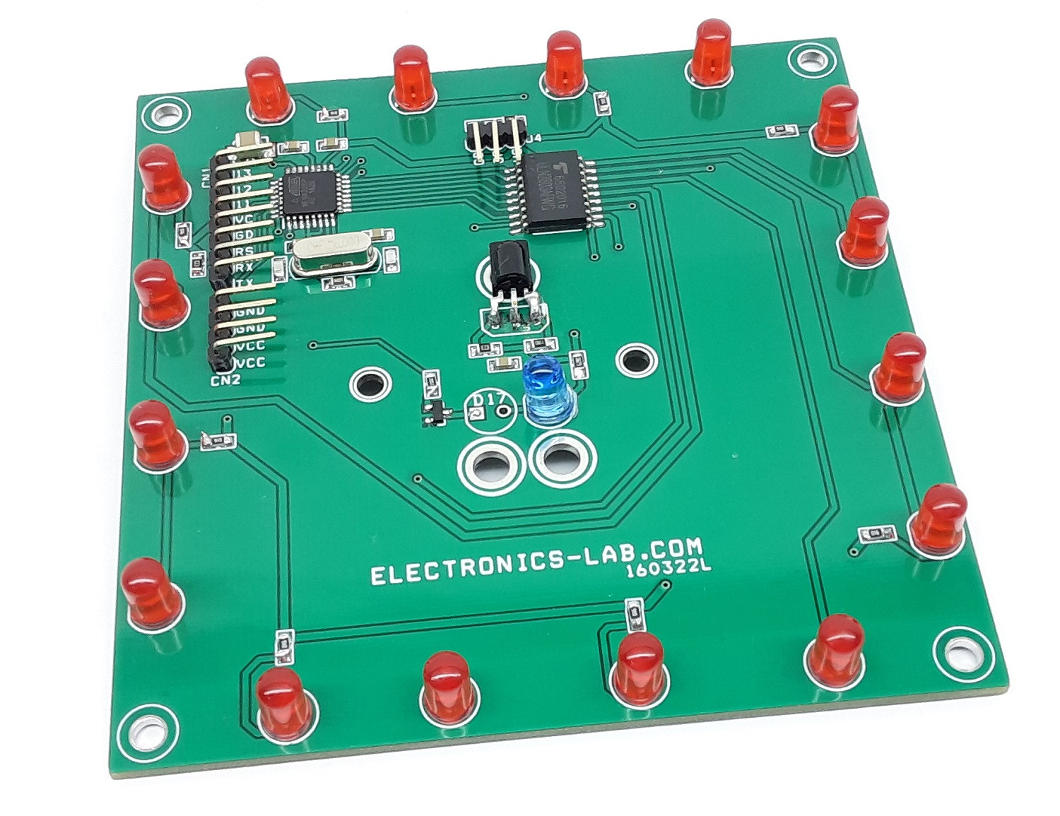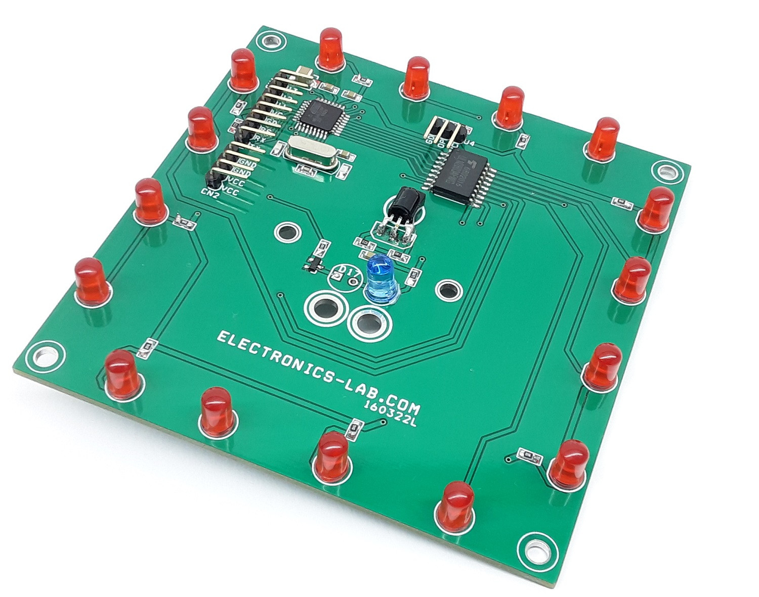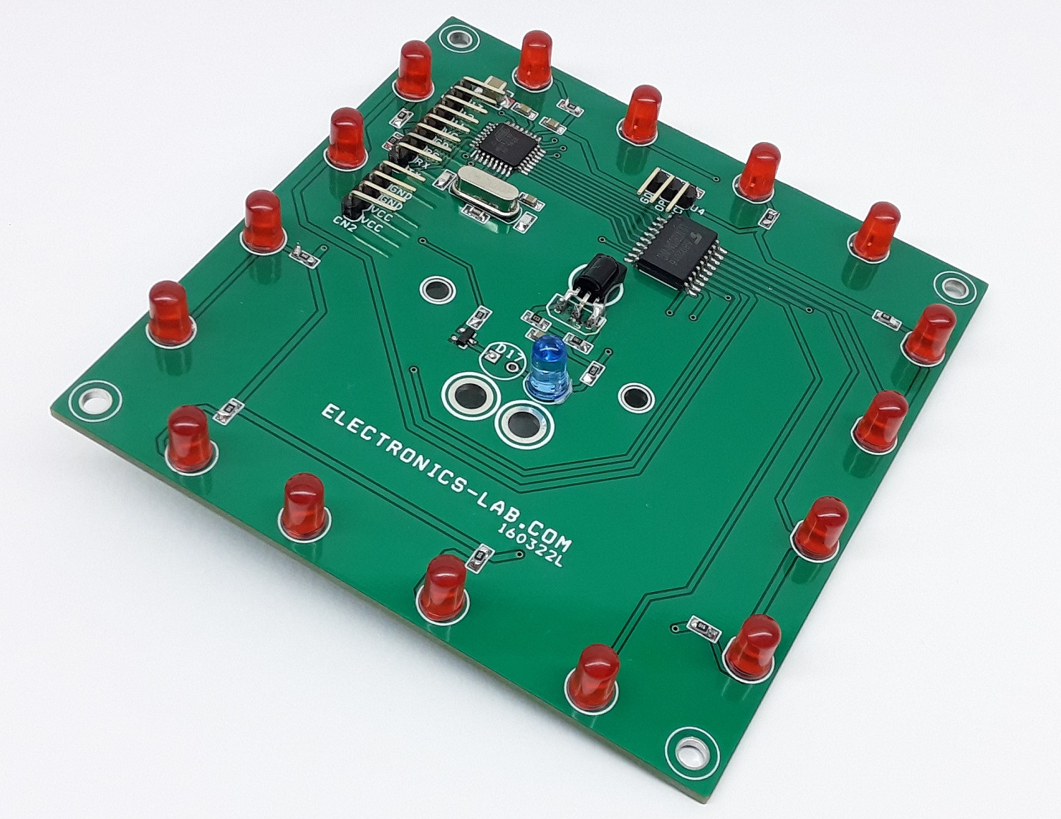 Projekt składa się z układu ATMEGA328, 16 diod LED o wymiarach 5 mm x 5 mm, wielowyjściowego sterownika ULN2803 dla diod LED, czujnika podczerwieni, diody LED podczerwieni 5 mm oraz tranzystora BJT BC847. Napięcie zasilania wynosi 5 V DC przy prądzie 200 mA.