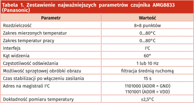 Podstawowym elementem składowym prezentowanego urządzenia jest czujnik typu AMG8833, produkowany przez firmę Panasonic. Zestawienie najważniejszych parametrów znajduje się w tabeli 1, zaś rysunek obudowy samego czujnika pokazano na rysunku 1. W niewielkiej obudowie, o wymiarach 8×11,6 mm, został zawarty kompletny system umożliwiający realizację termowizji – brakuje tylko wyświetlacza.