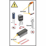 Montując elementy oznaczone wykrzyknikiem zwróć uwagę na ich biegunowość. Pomocne mogą okazać się ramki z rysunkami wyprowadzeń i symbolami tych elementów na płytce drukowanej oraz fotografie zmontowanych zestawów.