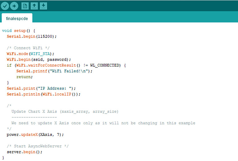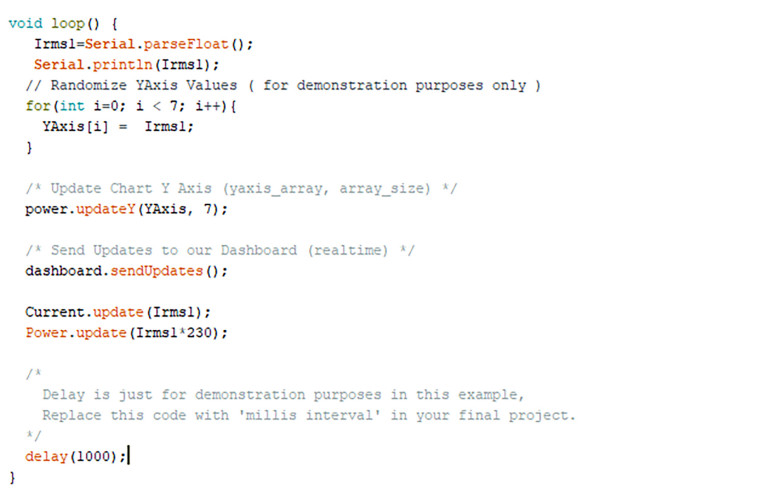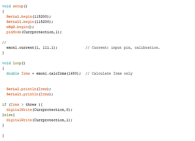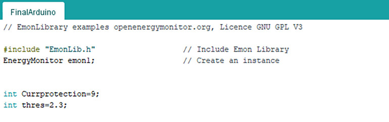 Dołącz bibliotekę EmonLib, a następnie zdefiniuj pin przekaźnika do przerywania obwodu. Następnie utwórz zmienną do przechowywania wartości progowej prądu, aby obwód automatycznie się przerywał, jeśli pobierany prąd elektryczny będzie większy niż wartość progowa. Potem utwórz funkcję setup() i ustaw szybkość transmisji szeregowej na 115200. Utwórz funkcję loop() do sprawdzania odczytu prądu elektrycznego. Upewnij się, że przekazujesz wartość do portu szeregowego, aby wyświetlić statystyki dotyczące zużycia prądu w panelu nawigacyjnym.