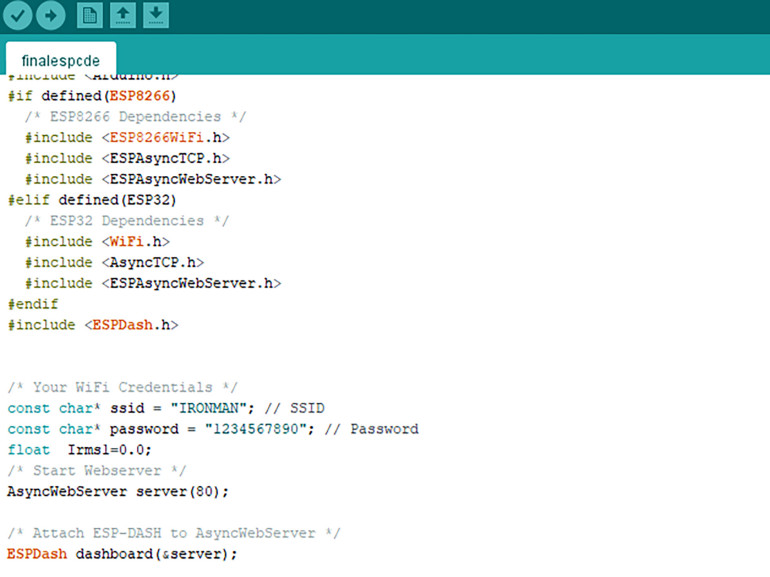 Dodaj płytkę Esp8266 do Arduino IDE. Postępuj zgodnie z instrukcjami zawartymi w tym artykule. Należy zainstalować biblioteki EmonLib do pomiaru prądu z czujnika prądu ZMTC103C oraz ESPDash, która wyświetli wykres/dane dla prądu elektrycznego i zużycia energii. Ponieważ moduł ESP8266-01 nie posiada pinu analogowego, użyj płytki Arduino i ESP8266 razem, aby odczytać prąd i wyświetlić go przez WiFi w webowym panelu nawigacyjnym. W dalszej kolejności należy przygotować kod dla Arduino, który będzie sprawdzał ilość prądu elektrycznego i automatycznie przerywał obwód, gdy zostanie wykryte przekroczenie prądu.